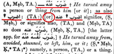 Students of classical Arabic and researchers of older Arabic lexicons will note however, that the preposition 'an' is not necessarily required to render the term 'Idribo'hunna' to turn away, shun, avoid or separate. This fact can be attested from the following lexicon excerpt of Edward Lanes who quotes TA (Taj-ul Urus), S (The Sihah), Msb (The misbah of El Feiyumi) and the K (The Kamoos) to discuss the relevant terms.