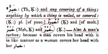 Even though the ‘Khimar’ has now become more commonly known in its restrictive sense as a ‘head covering’ for women the original meaning of a ‘Khimar’ (plural: Khumur) is anything by which a thing is veiled or covered. This is not restricted to a head covering or a covering of the hair. For a man’s turban is also known as a ‘Khumur’ as it ‘covers’ a man’s head.