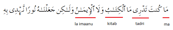 "And thus did We reveal to you an inspired book by Our command. You did not know (Arabic: ma kunta tadri) what the Book (Arabic: kitab) was, nor (what) the faith (was) (Arabic: la imaanu), but We made it a light, guiding thereby whom We please of Our servants; and most surely you show the way to the right path"