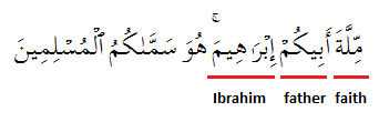 And strive for God with the endeavour which is His right. He has chosen you and has not laid upon you in religion any hardship; the faith (Arabic: millata) of your father (Arabic: abikum) Abraham (Arabic: Ibraham) (is yours). He has named you Muslims of old time and in this (Scripture), that the messenger may be a witness against you, and that ye may be witnesses against mankind. So establish worship, pay the poor-due, and hold fast to God. He is your protecting friend. A blessed patron and a blessed helper!