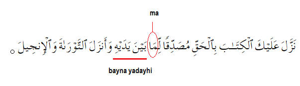 It is He Who sent down to thee (step by step), in truth, the Book, confirming what went before it (Arabic: ma bayna yadayhi); and He sent down the Law (of Moses) and the Gospel (of Jesus) before this, as a guide to mankind, and He sent down the Criterion (of judgment between right and wrong). Then those who reject faith in the signs of God will suffer the severest penalty, and God is exalted in might, Lord of retribution”