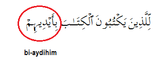 "Then woe to those who write the Book with their own hands (Arabic: Bi-Aydihim), and then say: "This is from God," so that they may take from it a small price!- Woe to them for what their hands do write, and for the gain they make thereby"