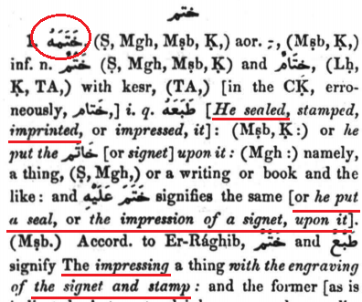 Please note the word 'Khaatam(a)' which in Arabic signifies a seal, or more accurately, an object used to seal or to put an impression of a signet on a writing or book. This endows it with a covering, an act of securing and implies the reaching of an end. This term's usage is even more significant when understood in the light of Prophet Muhammad's (pbuh) ministry which was to deliver the final message of God. Here the relationship of a signet or stamp to impress on a book to imply the ending of such a message cannot simply be overlooked.