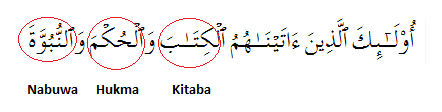 "These were the men to whom We gave the Book (Arabic: Kitaba), and authority (Arabic: Hukma), and Prophethood (Arabic: Nabuwa): if these (their descendants) reject them, Behold! We shall entrust their charge to a new people who reject them not"
