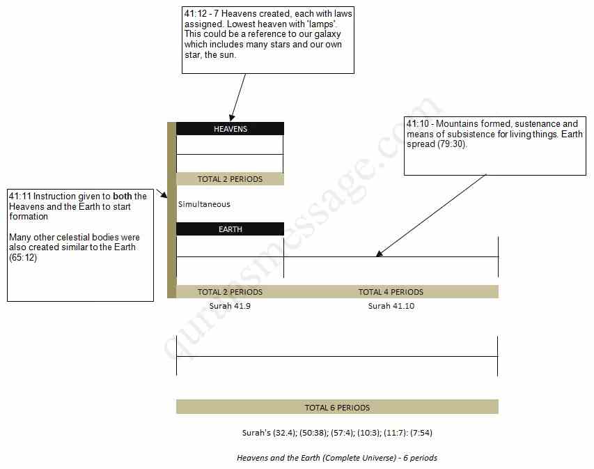 The Quran clearly and repeatedly states that the Heavens and the Earth took 6 'ayyamin' (periods, epochs) to form (7:54; 10:3; 11:7; 25:59; 32:4; 50:38; 57:4).