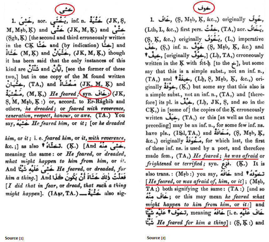 This general synonymy of 'khashiya' with 'khafa' to denote fear as mentioned in the lexicon excerpt above (left) is supported by the Quran where the terms have been used interchangeably. For example: