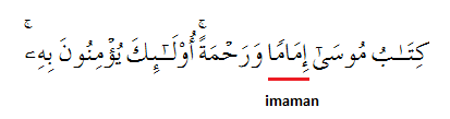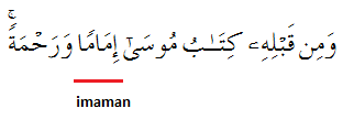 “And before this, was the Book of Moses as a guide / lead (Arabic: Imaman) and a mercy: And this Book confirms (it) in the Arabic tongue; to admonish the unjust, and as Glad Tidings to those who do right.”