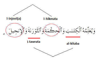 "And God will teach him The Book (al-kitaba) and The Wisdom (l-hikmata), and The Torah (l-tawrata) and The Injeel (l-injeel)"