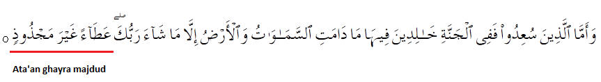 “And those who are blessed shall be in the Garden: They will dwell therein for all the time that the Heavens and the Earth endure, except as thy Lord wills: a gift without break (Arabic: Ata'an ghayra majdud)”