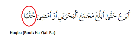 "And when Moses said to his servant: I will not give up until I reach the point where the two rivers meet, though I march on for ages (Huqba - Root: Ha-Qaf-Ba)"
