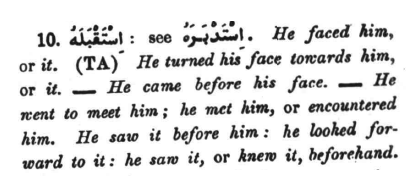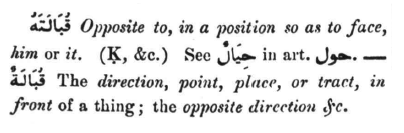 Other word derivates are also formed such as 'qubalatahu' which means opposite to, in a position so as to face him or it. Other words are also formed which imply a direction, point, place or something which is in front of another thing.