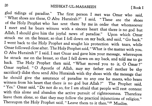[1] MISHKAT-UL-MASABEEH, Translation by Capt. A.N. Matthews, Revised and Edited, with Notes By: F.K.Khan Durrani, B.A. - Tabligh Literature Company, Railway Road, Lahore. Volume 1 Chapter 1, Page 19-20