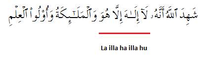 “There is no God but He (Arabic: La illa ha illa hu): That is the witness of God, His angels, and those endued with knowledge, standing firm on justice. There is no God but He, the Exalted in Power, the Wise”