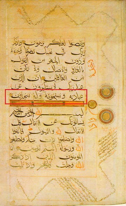 "This copy of the Quran consists of 246 pages sized 49.5x31 cm. with 15 lines to each page. Most of the script is written in black except for the word "Allah" which is in red ink throughout. Note also the exegetical comments in the margins taking the form of abstract geometrical designs. The "bihari" script is said to resemble a sword or a ship. Located in the King Faisal Center for Research and Islamic Studies in Riyadh, Kingdom of Saudi Arabia." [7]