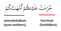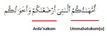 "...Mothers (women) (Arabic: ummahatukum) you gave you suck as a child (Nurse maids) (Arabic: Arda'nakum) are forbidden to you in marriage, as are your foster sisters"