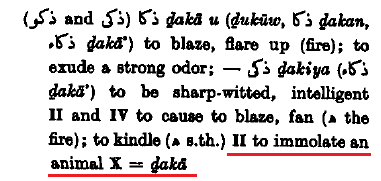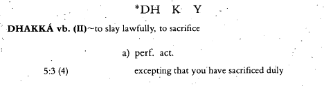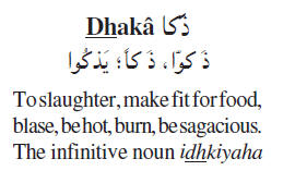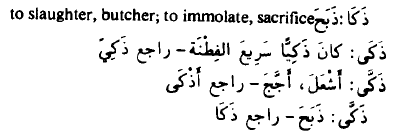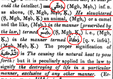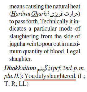 According to Ibn- manzoor (W.D, vol-I, 1073) Thakaytum means what is saved alive, while Al-nasafy (2000,272) states that Thakaytum means: except what can you slaughter and it is about to die, but Alshawkani (1994, vol-II, 10) says that “Al-thakah” according to Arab tongue means “to slaughter”. Abdulilah Al-Jawadi (1 – 23 )June 2009 University of Sharjah Journal of Shari'a & Law Sciences, Volume 6, No. 2 7 Ibn kathir (1990, vol-II, 11) states that Thakaytum means: except what you slaughter from those when it is still live.