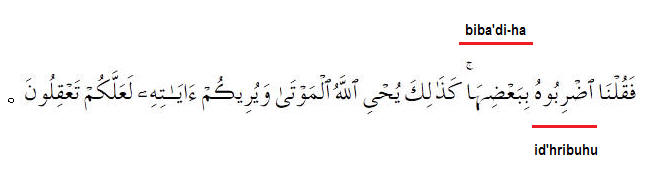 "So We said, "Strike him (Arabic: id'hribuhu) with a part of it/her (Arabic: biba'di-ha)" Like this God revives the dead and shows you His signs perhaps you many use your intellect"