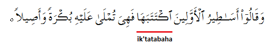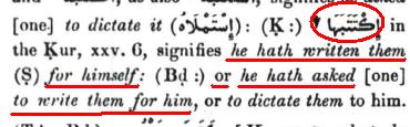 'And they say: Fables of the men of old which he has written down (Arabic: ik'tatabaha) so that they are dictated to him morning and evening'