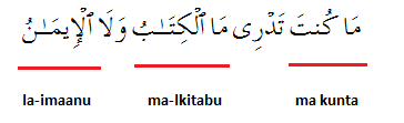 "And thus did We reveal to you an inspired book by Our command. You did not know (Arabic: ma kunta) what the Book was (Arabic: ma-lkitabu), nor the faith (Arabic: la imaanu), but We made it a light, guiding thereby whom We please of Our servants; and most surely you show the way to the right path"