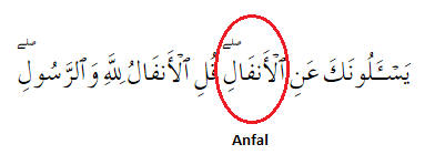 The Arabic word 'Anfal' has only been used twice in the Quran in this context in its plural form and in only one verse (8:1). In both cases, it refers to any gains which belong to God and the Messenger, in which the messenger acted as a treasurer for the specific benefits of his community.