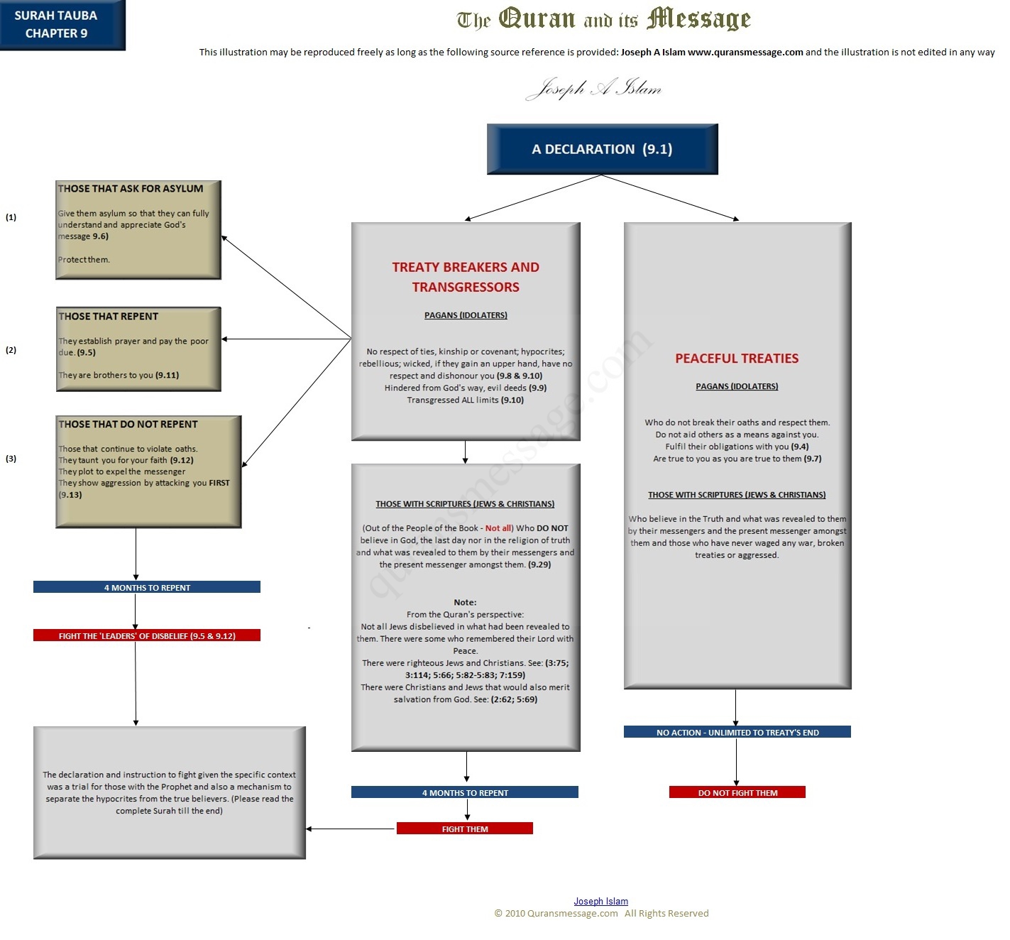Please also note the illustration below with regards Surah Tauba (Chapter 9), which is often widely misquoted and divorced from its proper context and includes the infamous 'killing verses'. This illustration makes the context and time specific nature of the declaration given in Surah (Chapter) 9 clear.