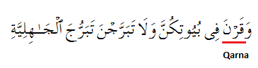 “Stay (Arabic: Qarna) in your homes and do not display your finery as women used to do in the days of ignorance (pre-Islamic days); establish Prayer, pay Zakah, and obey God and His Messenger. O People of the House, God only intends to remove uncleanliness from you and to purify you completely”