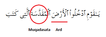 “O my people! Enter the Holy (Arabic: Muqadasata) Land (Arabic: Ard) which God has assigned to you, and turn not back, for then will ye be overthrown, to your own ruin."
