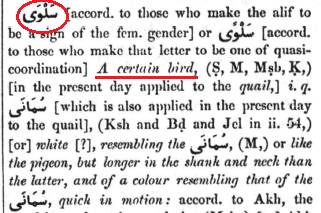 Furthermore, there is also a specific mention of ‘Salwa’ being sent to the Children of Israel and classed as good things to eat (2:57; 7.160; 20:80) along with Manna. Salwa’s classical meaning is a certain bird which in the present day applies to the Quail but is not restricted to it.