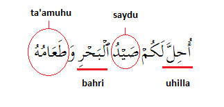 "Lawful (Arabic: uhilla) to you is the pursuit of game (Arabic: saydu) of the sea (Arabic: bahri) and its use for food (Arabic: ta'amuhu), for the benefit of yourselves and those who travel; but forbidden is the pursuit of game of the land as long as you are in the sacred precincts or in pilgrim garb. And fear God, to Whom you shall be gathered back"