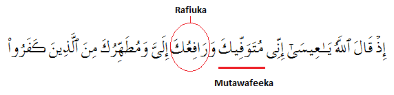 When God said: "O Jesus! Verily, I shall cause you to die (Arabic: Mutawafeeka), and shall exalt you (Arabic: Rafiuka) to Me, and cleanse you of [the presence of] those who are bent on denying the truth; and I shall place those who follow you [far] above those who are bent on denying the truth, to the Day of Resurrection. In the end, to Me you must all return and I shall judge between you with regards to all on which you differed.
