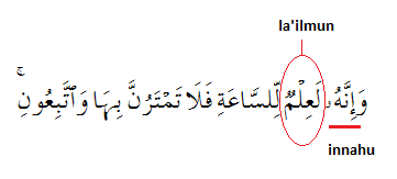 "And most surely it is / he (Arabic: innahu) a knowledge (Arabic: la'ilmun) of the hour, therefore have no doubt about it and follow Me: this is the right path"