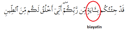 "And will make him a messenger to the Children of Israel, (saying): Indeed! I come to you with a sign (Arabic: biayatin) from your Lord. Lo! I fashion for you out of clay the likeness of a bird, and I breathe into it and it is a bird, by God's leave. I heal him who was born blind, and the leper, and I raise the dead, by God's leave. And I announce unto you what ye eat and what ye store up in your houses. Lo! herein verily is a portent for you, if ye are to be believers"