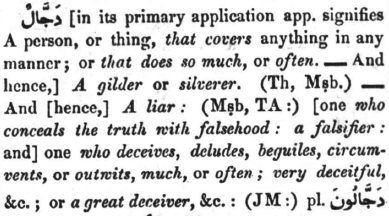 Dajaal is formed from the root word 'Dal-Jiim'Lam' which means to smear a camel with tar to conceal its bodily defects and further means to lie, mix, confuse and to conceal the truth with falsehood. Dajaal is also synonymous with 'Sihr' which means to make false appear to be true and to cause something to be imagined differently from what it really is; to deceive, beguile, delude, to embellish by falsification or deceit and is a kind of enchantment, or fascination which captivates.
