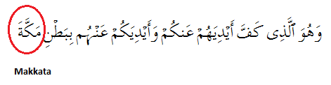 "And He it is Who has withheld men's hands from you, and has withheld your hands from them, in the valley of Makkah (Arabic: Makkata), after He had made you victors over them. God is seer of what you do"
