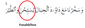 “So We made Solomon to understand it; and to each one We gave wisdom and knowledge; and We made the mountains, and the birds to celebrate Our praise (Arabic: Yusabbihna) with David; and We were the doers”