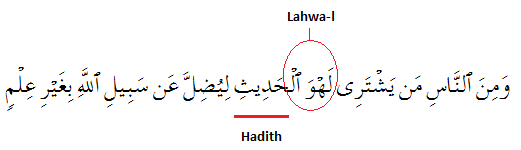 "But there are, among men, those who purchase idle (Arabic: Lahwa-l) tales (Arabic: Hadith), without knowledge, to mislead from the Path of God and throw ridicule (on the Path): for such there will be a Humiliating Penalty"