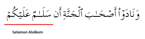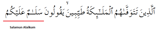 “Those whom the angels cause to die in a good state, saying: Peace be on you (Arabic: Salamun Alaikum): enter the garden for what you did”