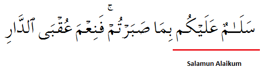 “Gardens of perpetual bliss: they shall enter there, as well as the righteous among their fathers, their spouses, and their offspring: and angels shall enter unto them from every gate (with the salutation): "Peace unto you (Arabic: Salamun Alaikum) for that ye persevered in patience! Now how excellent is the final home!"”