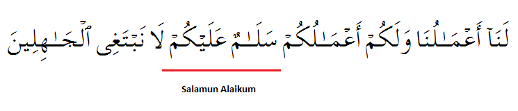 “And when they hear vain talk, they turn away from there and say: "To us our deeds, and to you yours; Peace be to you (Arabic: Salamun Alaikum): we seek not the ignorant."”