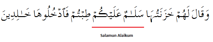 “And those who feared their Lord will be led to the Garden in crowds: until behold, they arrive there; its gates will be opened; and its keepers will say: "Peace be upon you (Arabic: Salamun Alaikum)! well have ye done! enter ye here, to dwell therein."”