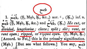 Means to split / rip, cut the throat, sacrifice, trench, to slaughter / massacre, slay in large number, that which is sacrificed, victim, slaughtered one.