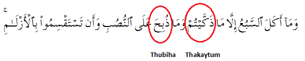 Please note that the Arabic word 'Thakaytum' has been used for 'slaughter' as a lawful manner of ending the life of an animal for consumption. This term appears in the same verse and is contrasted with the rejection of meat sacrificed on stone altars. Here the term 'Thubiha' is actually used, clearly indicating a familiarity of this process of sacrifice.
