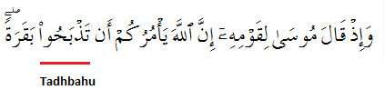 "And remember Moses said to his people: "God commands that you sacrifice (Arabic: Tadhbahu - Root: TH-BA-HA) a heifer." They said: "Do you make a laughing-stock of us?" He said: "God save me from being an ignorant (fool)!"