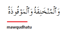 "Forbidden to you (for food) are: dead meat (Arabic: maytatu), blood (Arabic: damu), the flesh of swine (Arabic: walahmu-lkhanziri) and that on which has been invoked the name of other than God that which has been killed by strangling or by a violent blow (Arabic: mawqudhatu) or by a headlong fall or by being gored to death; that which has been (partly) eaten by a wild animal; unless you are able to slaughter it (Arabic: Thakaytum) (in due form); that which is sacrificed (Arabic: Thubiha) on stone (altars); (forbidden) also is the division (of meat) by raffling with arrows: that is impiety. This day have those who reject faith given up all hope of your religion: yet fear them not but fear Me. This day have I perfected your religion for you completed my favour upon you and have chosen for you Islam as your religion. But if any forced by hunger with no inclination to transgression God is indeed Oft-Forgiving Most Merciful""