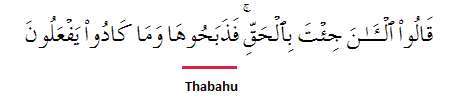 "(Moses) answered: Indeed! He says: Verily she is a cow unyoked; she ploughs not the soil nor waters the tilth; whole and without mark. They said: Now you bring the truth. So they sacrificed her (Arabic: Thabahu - Root: TH-BA-HA), though almost they did not"
