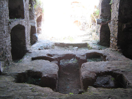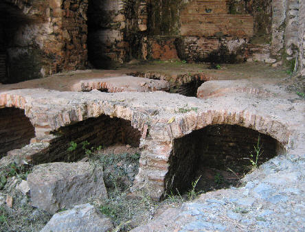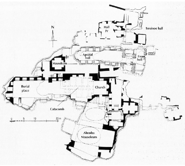 "One level above there is the centre of the complex, which is a church (12.6 by 10 m) to the south of the Apsidal Hall. The building consists of a square nave (about 6 by 6 m) and an apse to the east. On the opposite side there is a vestibule (length of about 5 m). A small catacombe with the assumed burial places of the Seven Sleepers was found beneath the floor of the church. In the west of the church another hall (Burial place: 15.8 by 7.25 m) with numerous graves in the soil and burial niches in the walls was erected. To the south of the church a large domed mausoleum (so-called Abradas-Mausoleum4) was built on the highest level of the complex." [8]