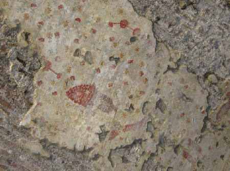 "Formerly the church as well as the burial hall and mausoleia were floored with mosaics and decorated with frescoes. Unfortunately only few original parts are preserved. The pavement of the church for example was an opus tessellatum, the geometrical pattern was laid in black and white. In the opinion of the excavator both - the church as well as the mosaic - are contemporary and were made in the 5th c. AD5." [7]